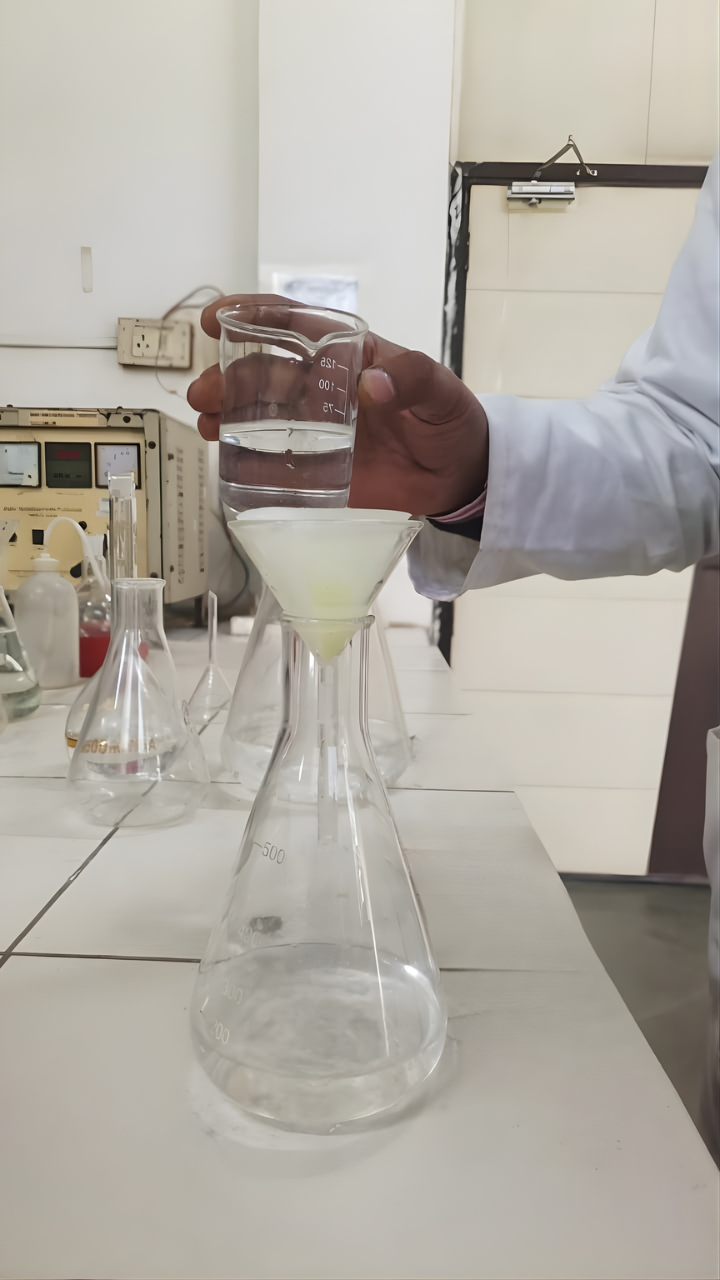 A controlled laboratory setup demonstrates the precise preparation of a chemical solution used for analyzing phosphorus levels in mild steel. The process involves carefully transferring reagents through a filtration setup to ensure clarity and accuracy before spectrometric analysis. This step is essential for determining the phosphorus concentration, which directly affects the strength, ductility, and weldability of mild steel.