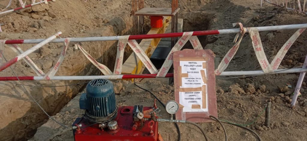 Pile Pull Out Test is conducted to measure the deflection of Pile in tension force. In this type of test, engineers first apply a tension load to the top of the pile using a hydraulic jack, which presses against a rolled steel joist or a suitable load frame. Afterward, they record the resulting settlement using dial gauges positioned appropriately.